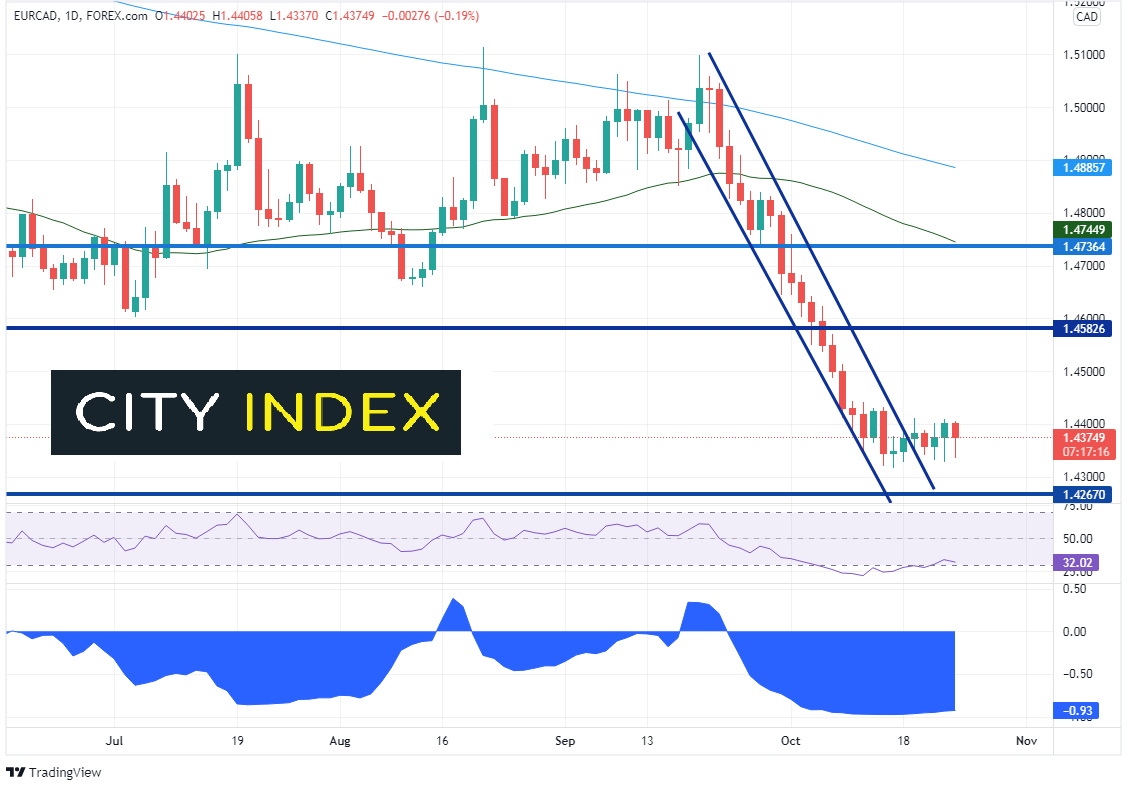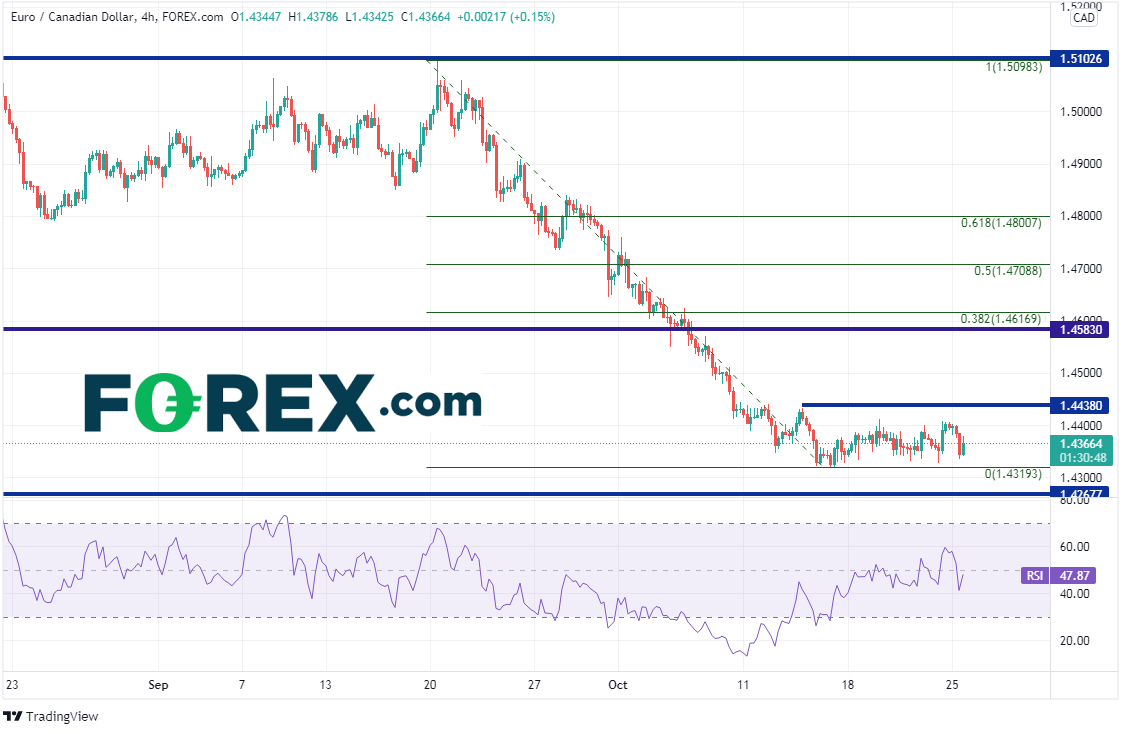 欧元/加元过去一周在1.4323-1.4432区间窄幅交投的行情在4小时图上更为明显。下破近期低点下看1.4268,那是2020年2月以来的疫情期间低点。如果攻克,价格可能跌至1.4000。近期阻力位上方是一个由水平阻力位与9月21日高点到10月15日低点行情的38.2%回档位构成的区域,即1.4617附近,接着是50%和61.8%回档位,分别在1.4709和1.4800附近。