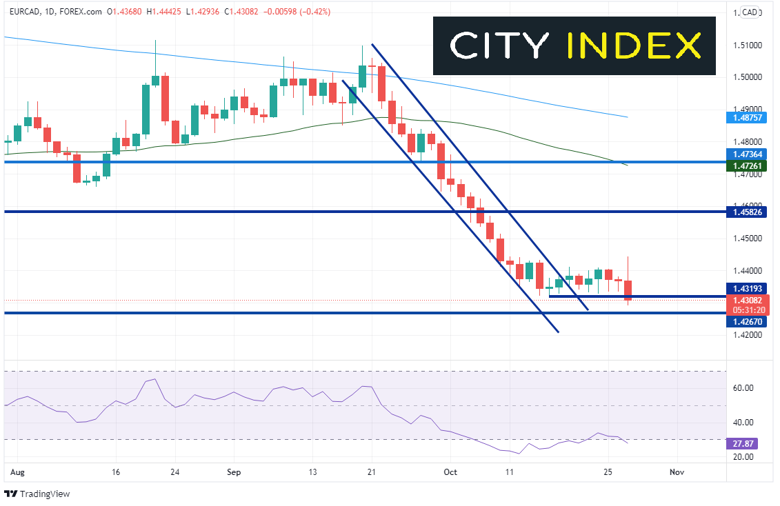 正如《本周货币对》一文中讨论过的,在明天欧洲央行和英央行都将召开会议的背景下,欧元/加元可能面临波动行情。事实上,就像美元/加元一样,欧元/加元同样走低。若汇价收于1.4337下方,日线图将构筑看跌吞没K线。此外,若汇价本周收盘下破1.4319,则周线图看跌吞没K线成形。下方支撑位在2020年2月低点1.4264。若失守,汇价可能一路探至2017年低点1.3784!阻力要回看今天高点1.4443附近。不要忘了,欧洲央行会议明天就要召开了!