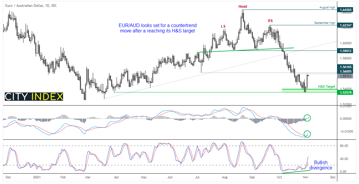 鉴于目标现已达成,空头应基于技术面和基本面发出的信号对进一步下跌保持谨慎态度。首先,欧元/澳元昨天上涨超过1.3%,创澳洲联储会议后近4个月来最看涨的一个交易日。在随机震荡指标上构筑多重背离(昨天的反弹证实了这一点),MACD指标买入信号也已成形,这些指标可能佐证较长线拐点的到来。由于澳洲联储态度不够鹰派,且交易商大量净做空澳元期货,货币对或将进一步反弹。