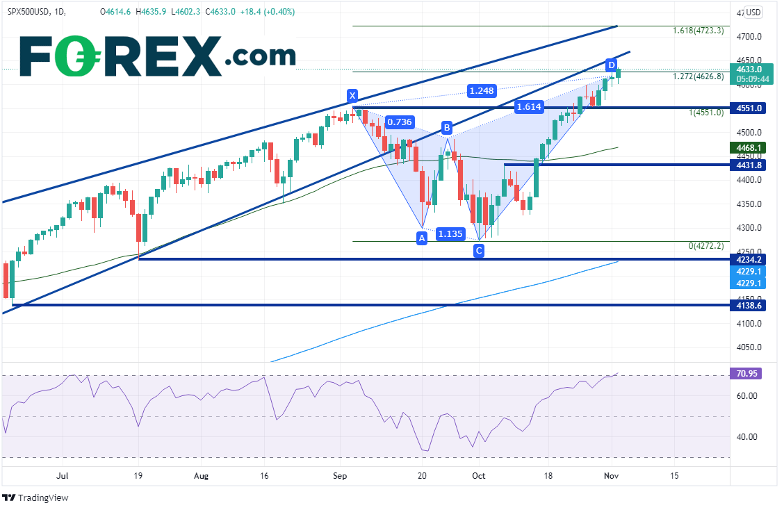 如果美联储的立场较预期强硬(比如加快缩表节奏,或者提到加息时间表),则标普500指数可能回撤。如果回撤,下档第一个支撑位在9月3日高点的上破位,即4551,接着是50天均线所在的4467.9、水平支撑位4431.8、10月1日低点4272.2。请注意,在FOMC会议召开前夕,标普500指数的RSI正进入超买区域,表明价格可能准备回调。另外,标普500指数日图已形成看跌shark harmonic形态,也是指示价格可能准备走低的信号。