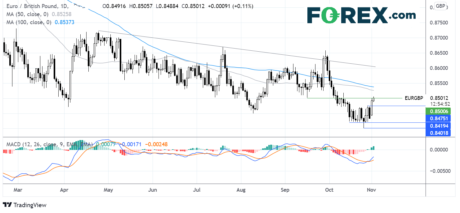 欧元/美元正扩大其自10月底0.84以来的反弹,MACD的金叉令多头期待货币对扩大涨势。
