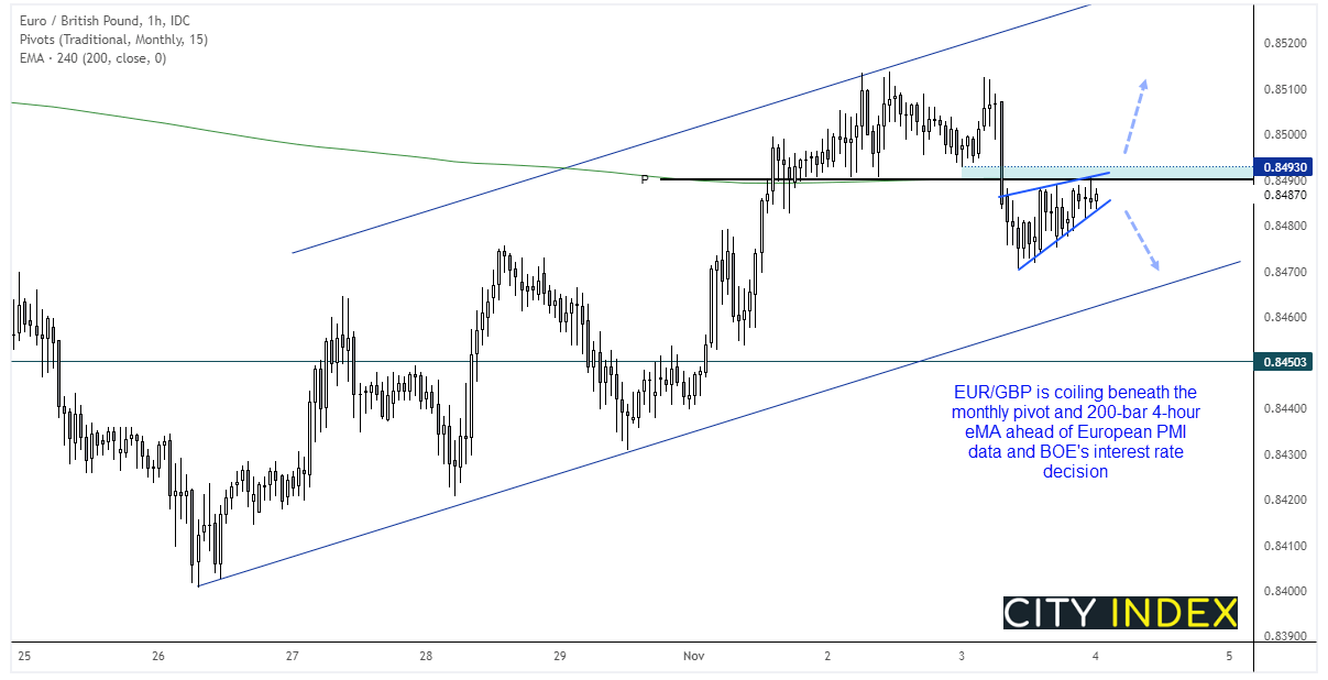 鉴于即将到来的欧洲数据和英央行会议日程,欧元/英镑成为今天波动性焦点。技术面来看,货币对正处在一个有趣的转折点上,于月图枢纽和200K均线(4小时图)下方的楔形形态内盘绕。因此,若欧洲数据整体疲弱而英央行大幅加息,货币对将重回下端趋势线。反之,强劲欧洲数据结合不加息/鸽派英央行将将带动货币对上穿阻力区域,符合其看涨趋势通道。对交易员来说,今天最糟糕的结果为欧洲数据喜忧参半,而英央行会议成果既符合预期,同时又发出令人困惑的讯息。