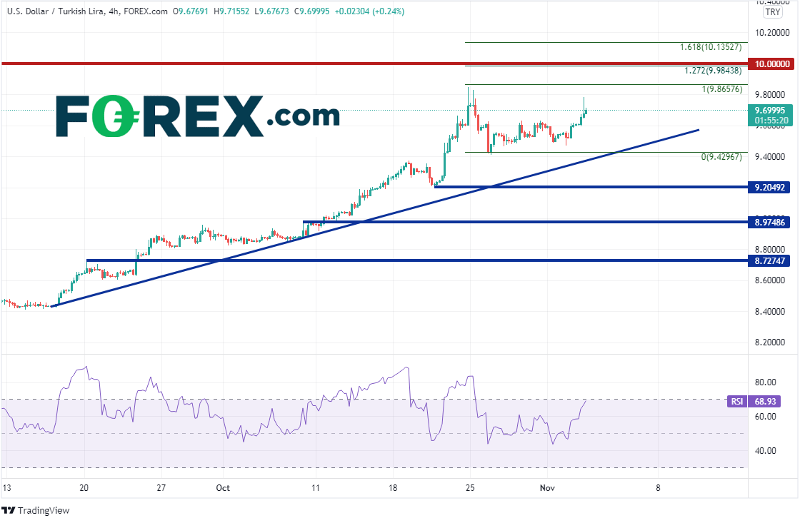 美元/土耳其里拉4小时图站上10月25日以来高点,上看10月25日高点到10月26日低点行情的127.2%扩展位,即9.9844附近,以及心理整数关口10.0000。下个阻力位在同期行情的161.8%扩展位10.1353附近。支撑位在10月26日低点与9月中旬以来上斜趋势线相汇的9.4297附近,然后是10月20日低点9.2049。