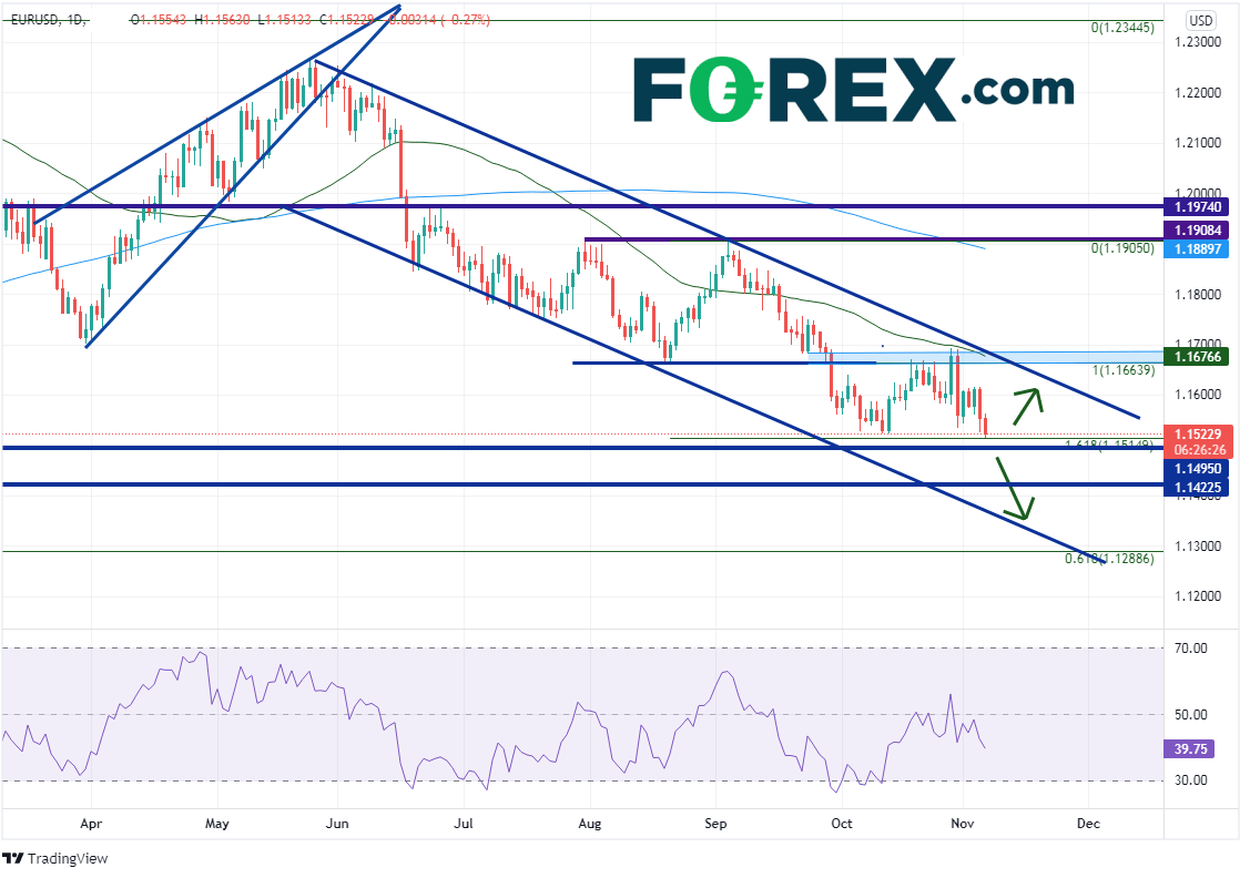 4小时图上1.1495下方的支撑位在10月12日低点到10月28日高点行情的127.2%扩展位,即1.1479附近,然后是同期行情的161.8%扩展位和2020年6月以来水平支撑位相汇处,即1.1421附近。短线阻力位在1.1616,接着是上述通道的下斜趋势线、50天均线和近期高点相汇而成的阻力带,即1.1675-1.1700区间。