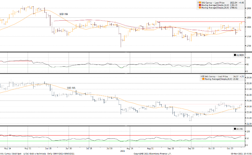 黄金与白银在上周五的急速上升势头延续到本周一,其中黄金价格切实脱离其10天均线。从8月中旬到11月初,该均线一直非常接近于金价,而金价围绕着一个非常狭窄的下跌趋势徘徊。两个交易时段的波动之迅速给人感觉金价好像突破了束缚,但事实并非如此。金价反而在逼近2个月高点1825时进入了超买区域,10天均线现落在1797,构成支撑。