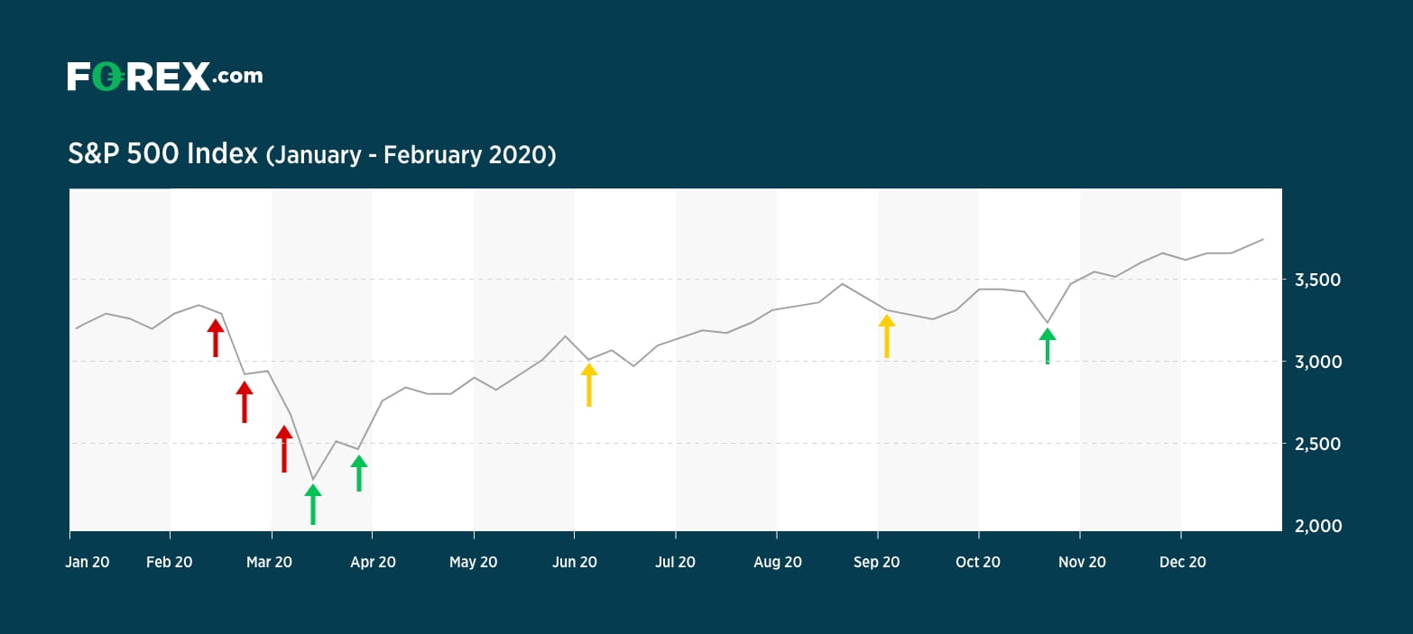 上面的图形,前三个红色箭头代表标普500指数在2020年年初的几次下跌。