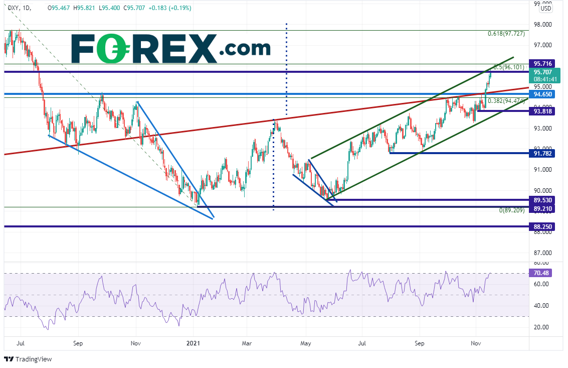美国零售销售被预期高于预期,结果也满足了预期。英国和加拿大10月零售销售也定于本周晚些时候发布,它们会不会同样强劲?如果同样强劲,在RSI尝试回到中性区域之际,美元指数可能自阻力回落,而欧元/美元可能反弹。本周请留意更多波动性。
