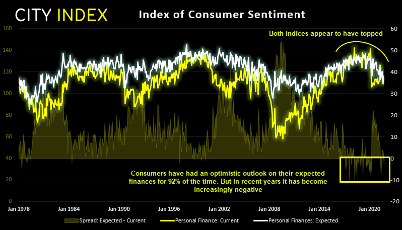 如下图所示,两个“个人理财”指数似乎已经在长期图表上达到峰值,表明长期周期在2019年第四季度见顶。如果我们看看两者之间(预期-当前)的差值,就会发现它们呈现两种清晰的模式。