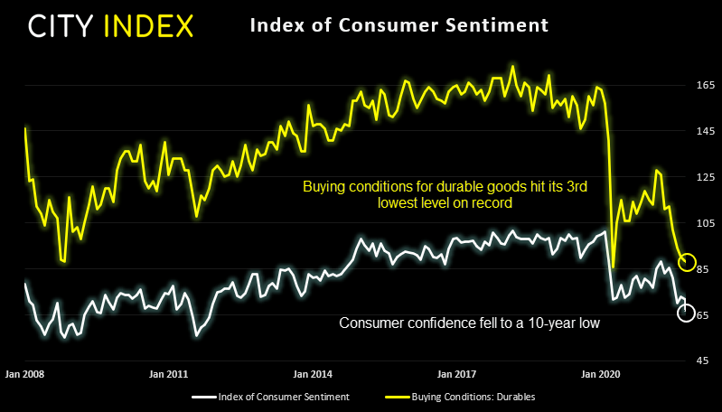 但对我们来说,这份报告最大的启示在于消费者在关注物价上涨同时,显然也十分在意自己的财务状况。因此,我们猜测消费将会下降,从而助力减轻部分消费价格压力,但这对增长数据的影响更大。美联储或因此进退两难,因为他们可能需要加息以遏制通胀,但如果经济增长因此受到影响,他们可能又不想加息。