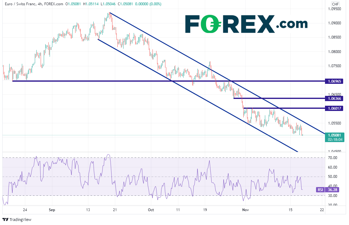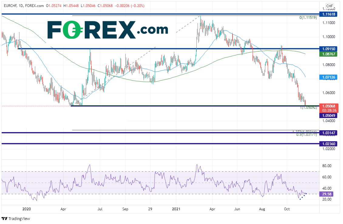 欧元/瑞郎缓慢但坚定地上涨并在2018年年中测试了1.2000,只是后来屈服于抛压再次走弱。然后就来到了今天。该货币对目前落在2020年5月的最新低点构成的水平支撑位1.0505附近,如果失守,可能跌至2015年7月以来最低点。第一支撑位在下图4小时图上的1.0440附近,但如果攻克,下一支撑位在遥远的1.0334附近,那是2020年5月低点到2021年3月4日高点行情的127.2%扩展位。该位之下不远处就是2015年6月以来水平支撑位1.0314,然后是2015年1月15日低点(基于Tradingview的低点)到2018年年中高点行情的50%回档位,也在1.0314附近,再接着就是遥远的1.0236附近,那是2015年4月低点。请注意,RSI正与价格(正落在支撑位)背离,表明欧元/瑞郎或蓄势准备反弹。