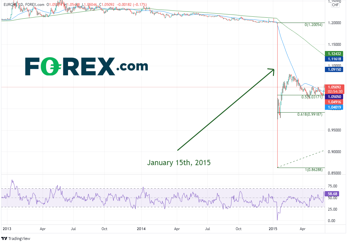 欧元/瑞郎在2015年1月15日的数秒内瞬间暴跌近1400点子之后,距今已经过去了很长时间,现在看起来可能准备再次下跌,至2015年6月以来最低点。但这次的下跌很可能跌幅、跌速都无法和那致命的一天相提并论。不过,下跌175点子,至1.0334的可能性无疑值得警惕。