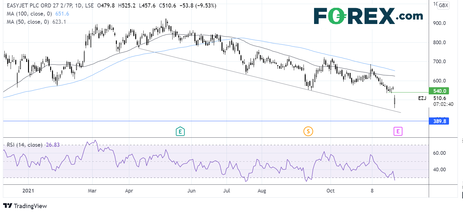 易捷航空股价自5月初触及疫情后921便士高点以来一直呈下跌趋势。此后,股价构筑一系列高点和低点降低。