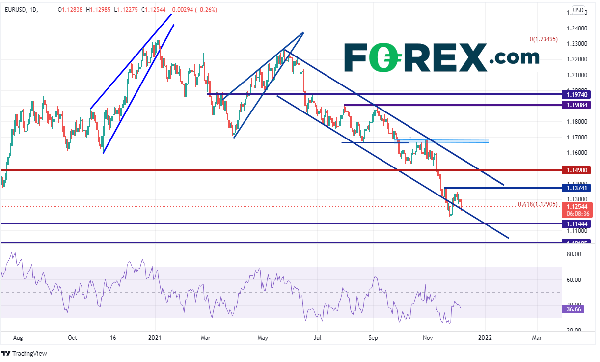 上述出人意料的数据公布后美元指数旋即自96.20附近摸至96.40。美元指数5月底在89.53附近向上突破一个下降楔形,此后一直有序上涨。11月19日,该指数站上96.10附近的通道上轨,后于11月26日回到通道内。在那之后,美元指数一直交投于95.70-96.50区间。阻力位在11月23日高点96.94,然后是2020年3月高点下跌至2021年1月低点行情的61.8%回档位97.73。水平阻力位兼双底形态的目标在98.17附近。当然,价格同样可能受下行动力的吸引。如果确实下跌,则支撑位在旗形下轨95.95附近。目标在2011年以来的长期上斜趋势线附近,即95.09一线。如果攻克,下看通道下轨趋势线兼水平支撑位94.65附近。