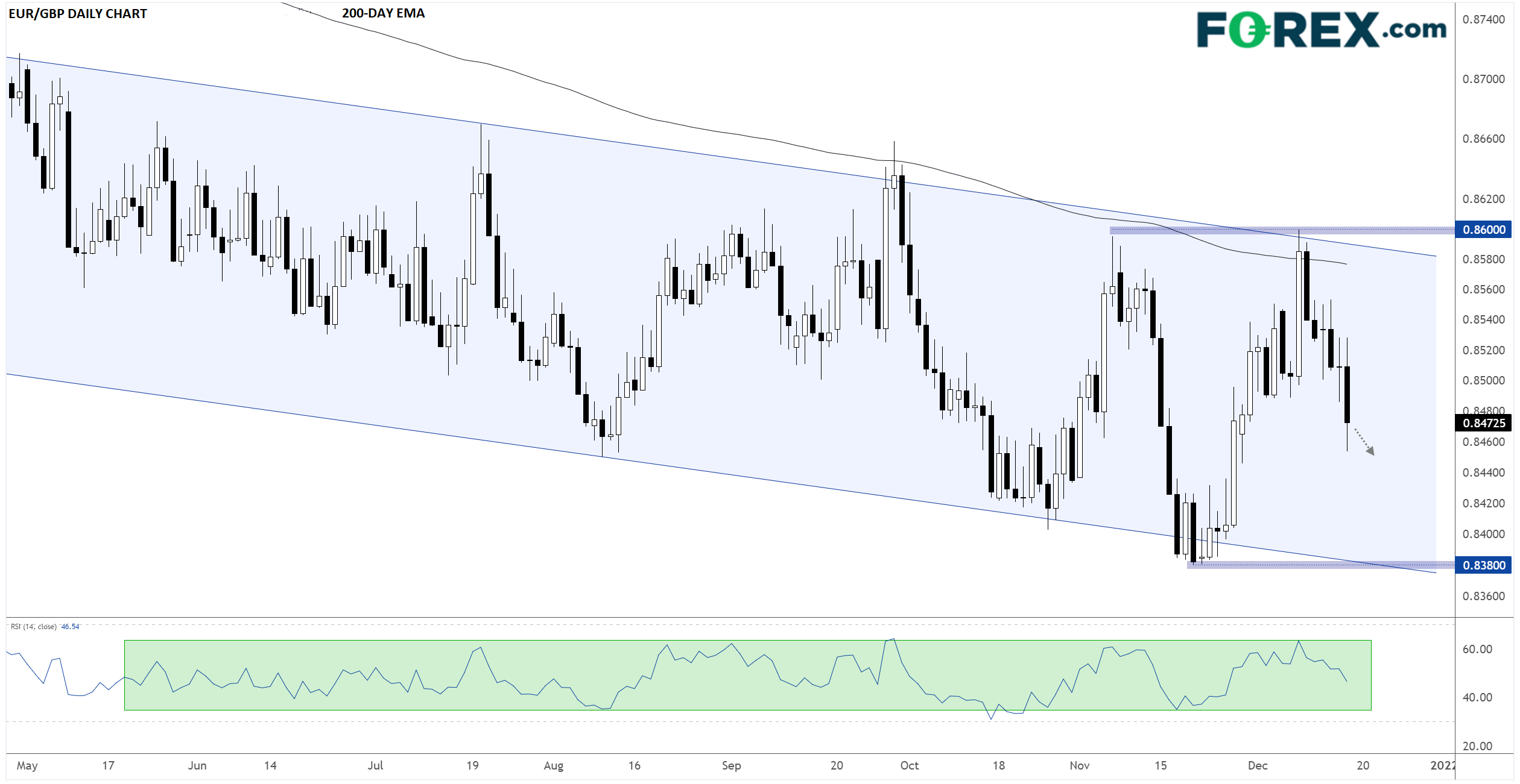 如下图所示,欧元/英镑在上周中测试由前高点、200天指数移动均线和下跌通道构成的阻力带所在的0.8600附近之后到现在下跌了125点子左右,空头似乎占据主导,有机会在假期到来将驱动该交叉盘扩大当前下跌趋势,下探0.8380下方的2021年低点。