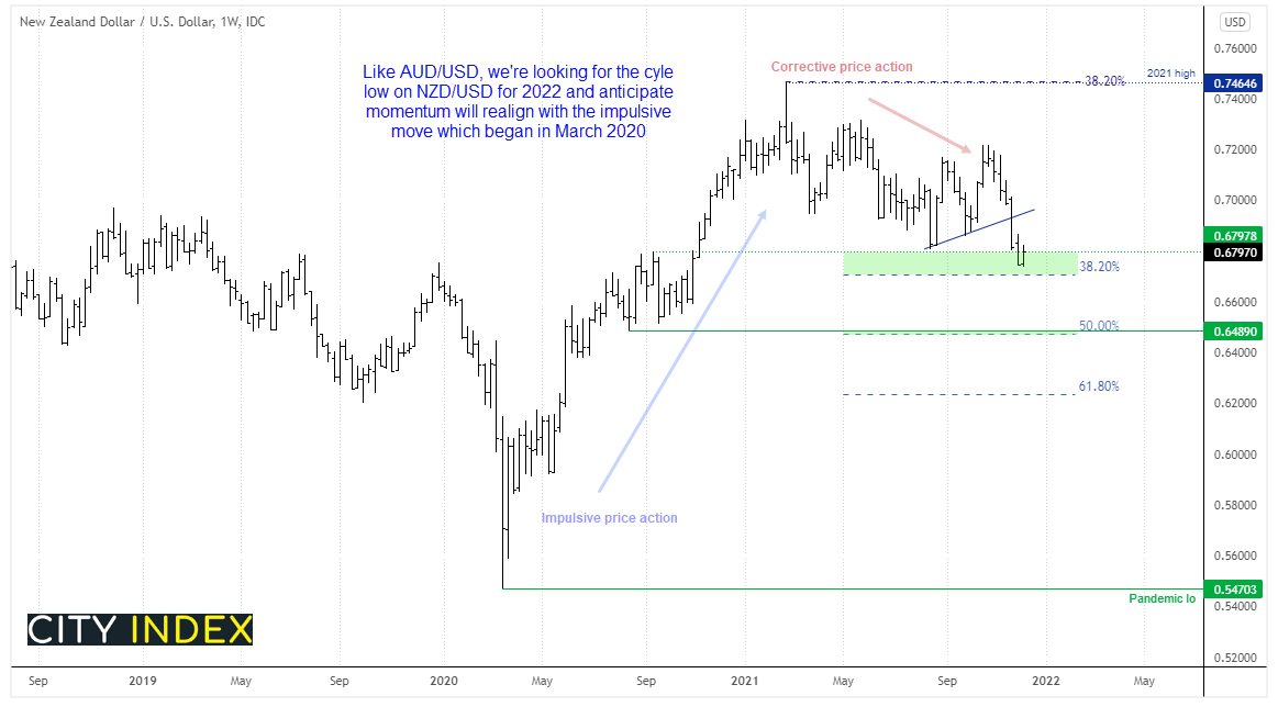 澳元和纽元都在2020年形成了V型底部,并探入主要低点,整个2021年持续推低。但纽元/美元尚未构筑看涨背离,其快速RSI超卖程度也不及澳元/美元(后者RSI探入2020年3月低点)。我的看法是,因为动量降幅低于澳元,纽元总体更为强劲,但短线背离的匮乏意味着其还有进一步修正空间。纽元尚未测试0.6700附近38.2%回档。但如果它真的触及修正低点,那么像澳元一样,自此引出的38.2%投射位也将提供一个2022年初始目标。
