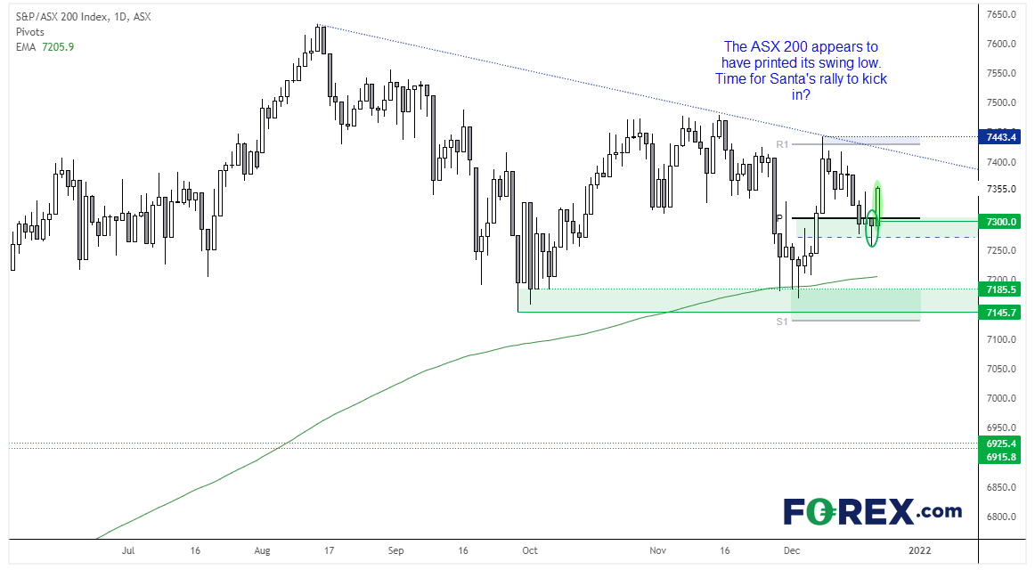 7443高点以来的下跌似乎是修正行情,周一在61.8%回档位附近形成的看涨锤子形态暗示其正在接近尾声。昨天收出大阳线更是说服我们修正低点确实就位,期待今天可以守住7300/月图中枢位并上攻7400(如果保持昨天的方向与波动性,今天不难实现),可行的目标是短线趋势线阻力位和月图第一枢轴阻力位 – 但若最终证实“圣诞反弹”刚刚启动,那么ASX200指数甚至可望在新年前创下新高。