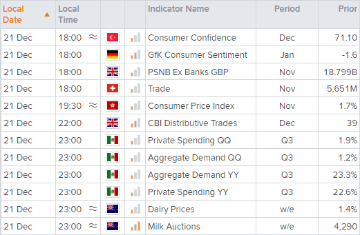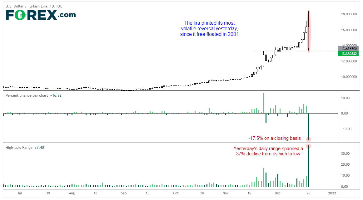 土耳其目前通胀率在21%左右,预计2022年上升至30%左右。纵然如此,土耳其总统Erdogan还是捍卫其在高通胀环境中降息的政策,于周日声称“我们正在降息,不要期待我们会做别的”。土耳其里拉在周一先是跌至历史新低,但随着Erdogan表示,土耳其政府将采取新的举措,保护居民存款免受汇率波动的冲击(只是没有说明具体的措施),里拉创下2001年自由浮动以来的最大单日涨幅。美元/土耳其里拉因此收低17.4%左右,而日内高低点区间更是高达不可思议的37.3%