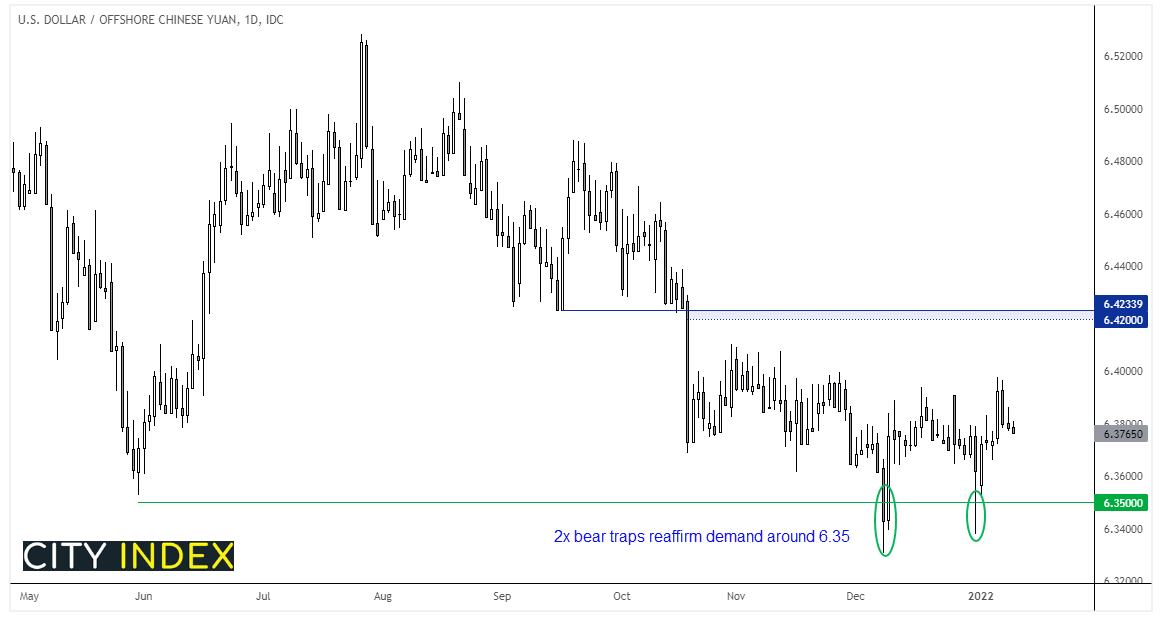 12月8日,美元/离岸人民币汇率收于6.35下方,但次日迅速收复失地,标志空头陷阱。12月31日第二次尝试下穿6.35后迎来尾部买盘,当天收于该关键水平之上。汇价现已走高,我们3.65上方继续看涨并寻求汇价攻向6.42。多头可以等待升穿趋势阻力位/近期高点再行做多。在此之前,货币对仍存在新一轮下跌风险。