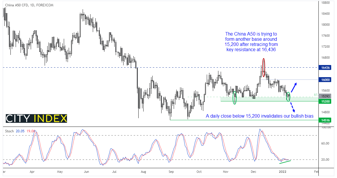 自达成我们初始目标16436后,富时中国A50指数稳步推低。我们在12月注意到反转K线未能收于该关键水平之上,从而最终启动修正行情。虽然指数未能如我们所希望的守住16000上方,但似乎已于15200上方找到支撑,而且一系列前低点及收于该水平之上的锤子线也表明15200上方存在买需。