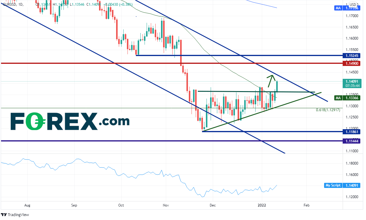 欧元/美元在美元指数中的占比高达58%,这个事实可能让人联想到在美元指数下跌时该货币对上涨,而今天到目前为止的走势确实如此。欧元/美元在1.1370附近突破上升三角形,目前上攻2021年5月以来长期通道的上轨,该下斜趋势线落在1.1435附近,构成第一道阻力。第二个阻力位在长期水平阻力位1.1490/1.1500,然后是略高于该位的1.1525。下档支撑位在50天均线1.1337、上升三角形的下轨上升趋势线1.1290附近。如果下破1.1290,后市可能跌至2021年11月25日低点1.1186附近。
