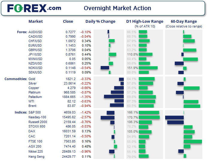 对利率敏感的科技股领跌,导致纳斯达克100指数下挫2.6%,收于3个月低点。道指坚定收于其50天指数移动均线下方,创下3周低点。标普500指数收于4600和日图趋势支撑线下方。波动率(VIX)升至1个月高点22.87。