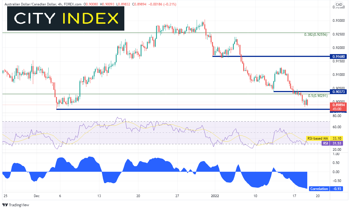 巧合的是,240分钟时间轴上,10年期美债收益率与澳元/加元之间的相关系数也是-0.93!因此,短线负相关性同样强烈。这意味着如果收益率继续走高,澳元/加元应会进一步下挫。跌破0.8972可能触发止损。支撑位一直要下看前述时间轴内61.8%回档0.8810。水平阻力落在0.9037、0.9100和0.9159。如若10年期美债收益率走低,且/或汇价紧随RSI反弹,澳元/加元跌势有望于上述任一水平暂停。