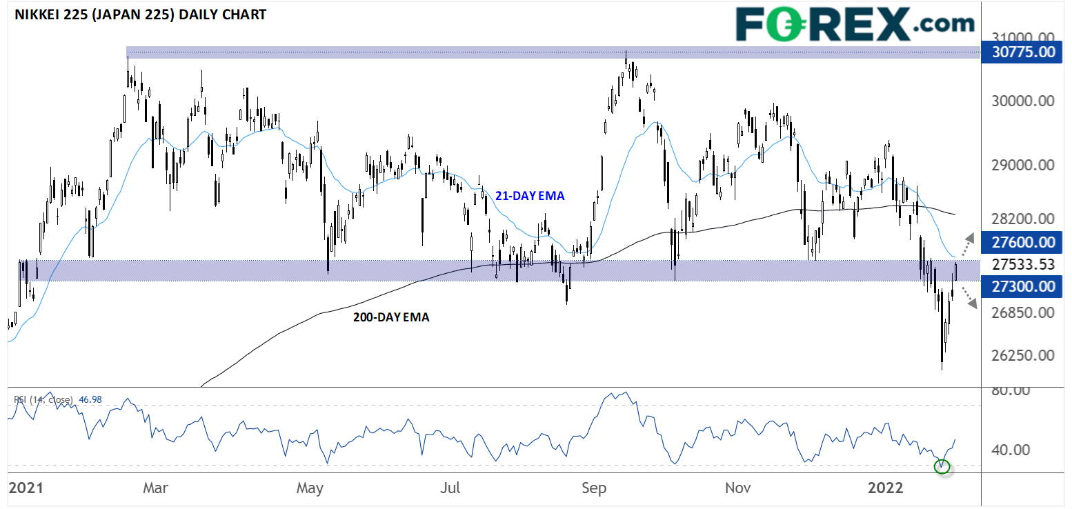 日经225指数(日本指数)在2022年第二个交易日站上29,300,然在接下来三周跌超10%,上周在26,000一线下轨创下14个月低点。经过本周上半周令人惊艳的反弹后测试27,300-27,600这一关键技术区域。