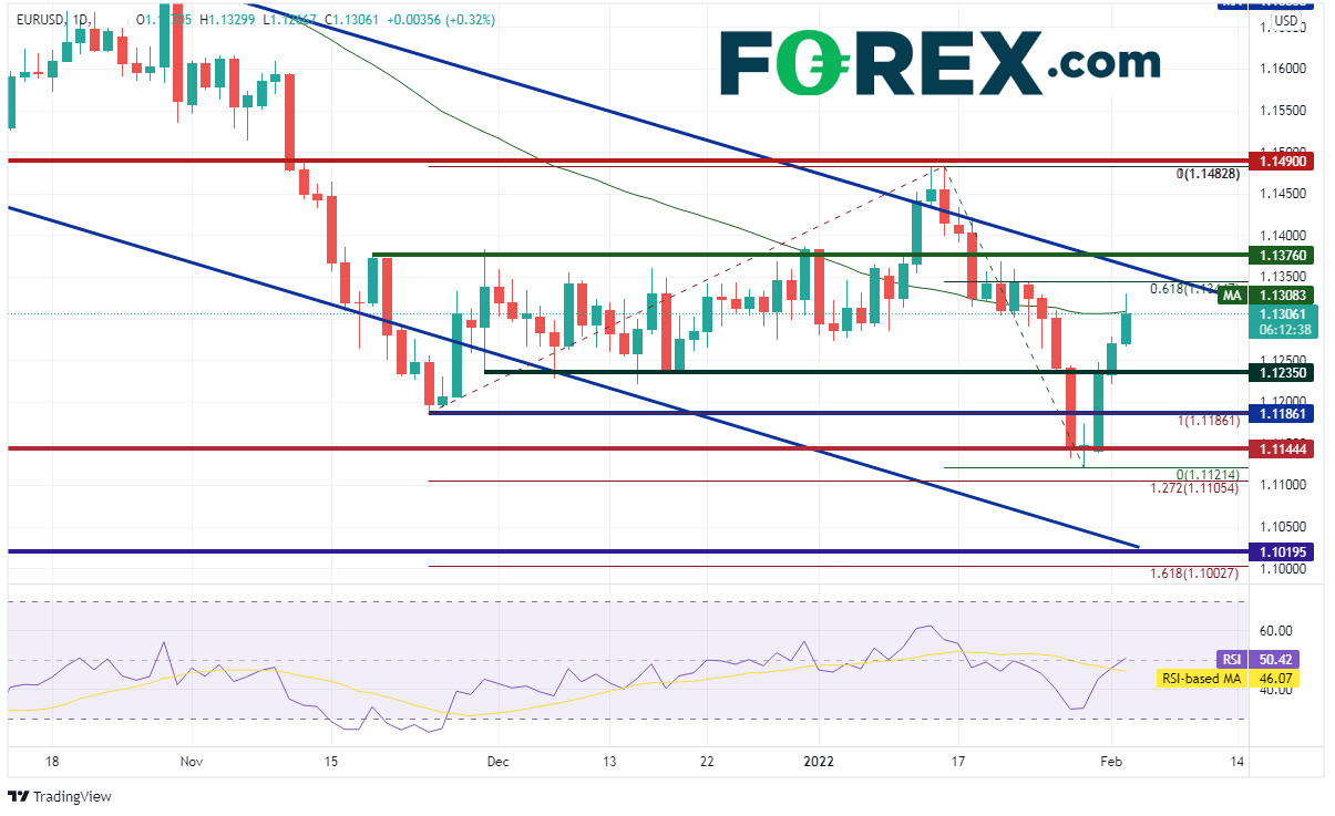 欧元/美元日图大涨击破50天均线1.1308后上攻1月14日高点到1月28日低点行情的61.8%回档位,即1.1344附近,之后空头涌现。如果攻克1.1344附近,先后上看下降通道的上轨趋势线1.1366附近、水平阻力位1.1482附近。支撑位在昨天低点1.1220、水平低点1.1186、1月28日低点1.1121、2021年11月24日低点到2022年1月14日高点行情的127.2%扩展位1.1105。