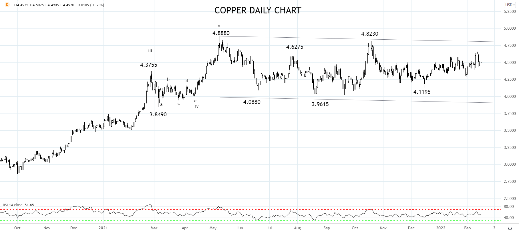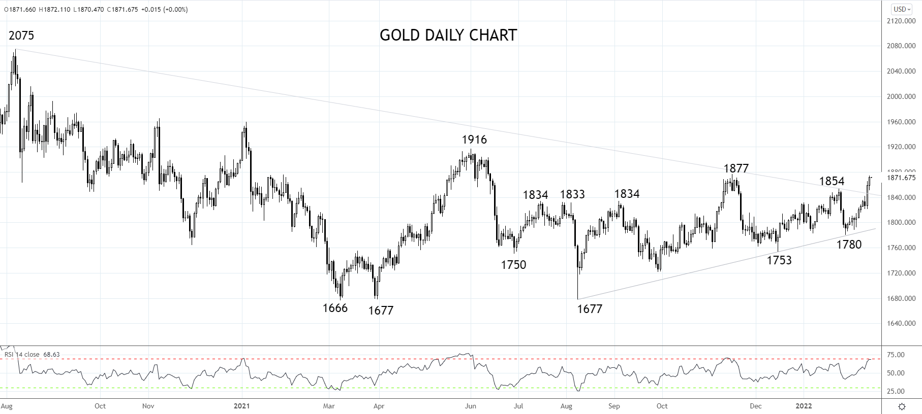 若金价能守住支撑位1845/33美元(日收盘),预期金价将继续攻向1950美元。需要注意俄罗斯/乌克兰紧张局势相关头条将影响金价后市走向。