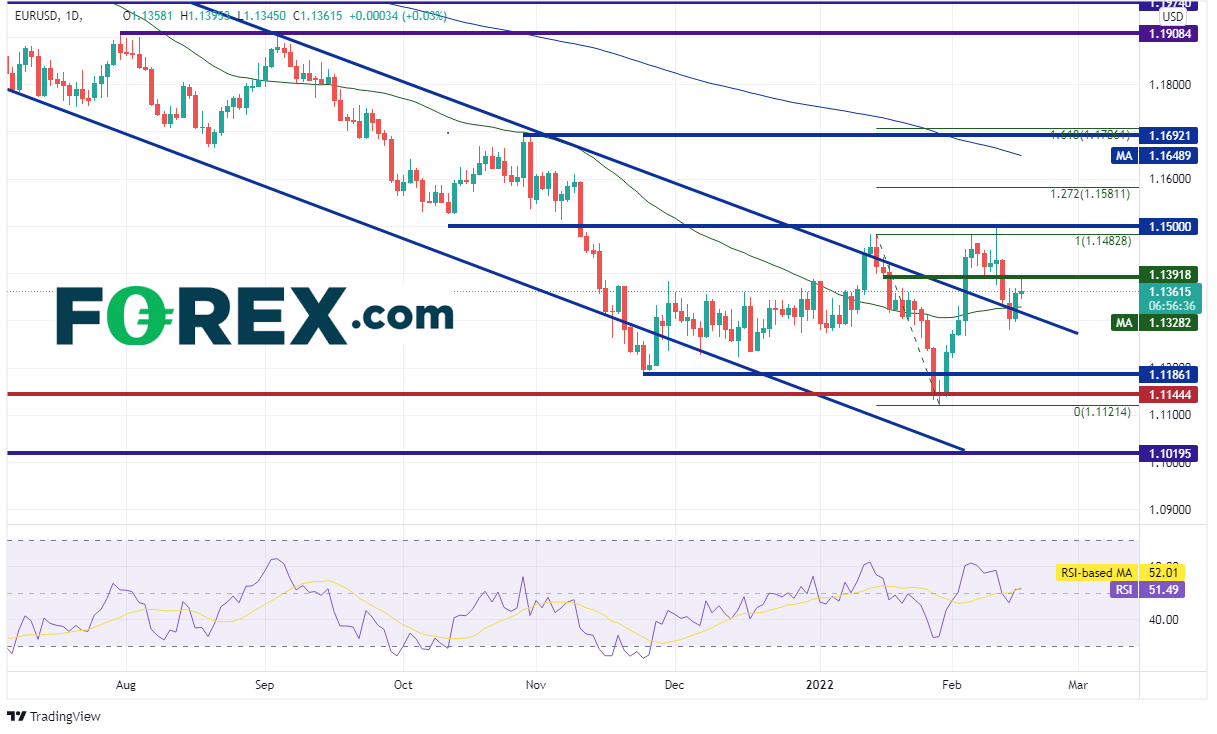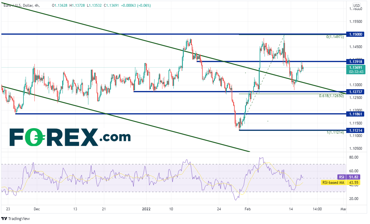 欧元/美元日图于50天均线所在的1.1328以及2021年5月以来的下降通道上轨上方不远处徘徊,水平支撑位落在今天高点1.1395附近,如果可以站于其上并攻克水平阻力位,可能极大地打开上涨空间,上看最近一直破坏反弹的1.1500阻力。其它阻力包括2月10日高点1.1497(非常接近于1.1500)、1月14日高点到1月28日低点行情的127.2%扩展位1.1581附近,以及200天均线1.1649。