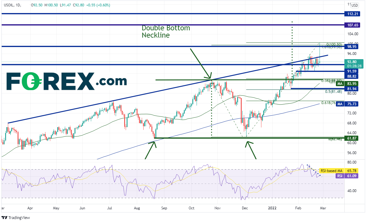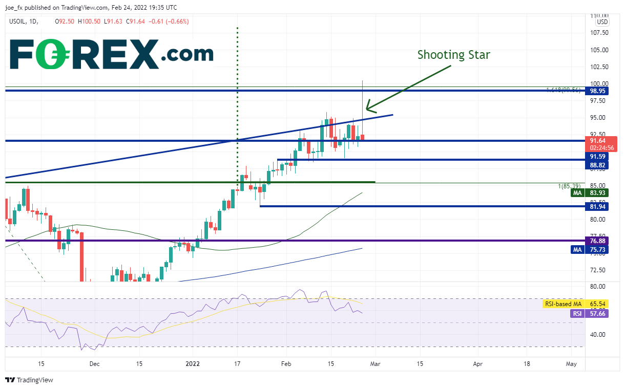 随着俄罗斯全面入侵乌克兰,西得州原油创下2014年以来最高点100.50。油价今天从低点到最高点的幅度超过8.5%,此后回落且当天收盘仅斩获0.35%的涨幅。但回落并不意味着后市失去高位,反而甚至可能攻克100.50。毕竟,欧洲有30%的原油供应来自俄罗斯。交易者本来担心西方国家就俄罗斯对欧能源输送进行制裁,结果宣布的措施目前看来完全与能源无关。今天的日图K线因此呈现“听传闻买进、见事实沽出”的行情,即价格冲高回落。
