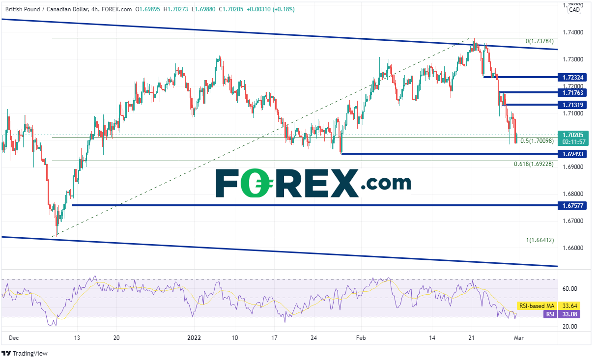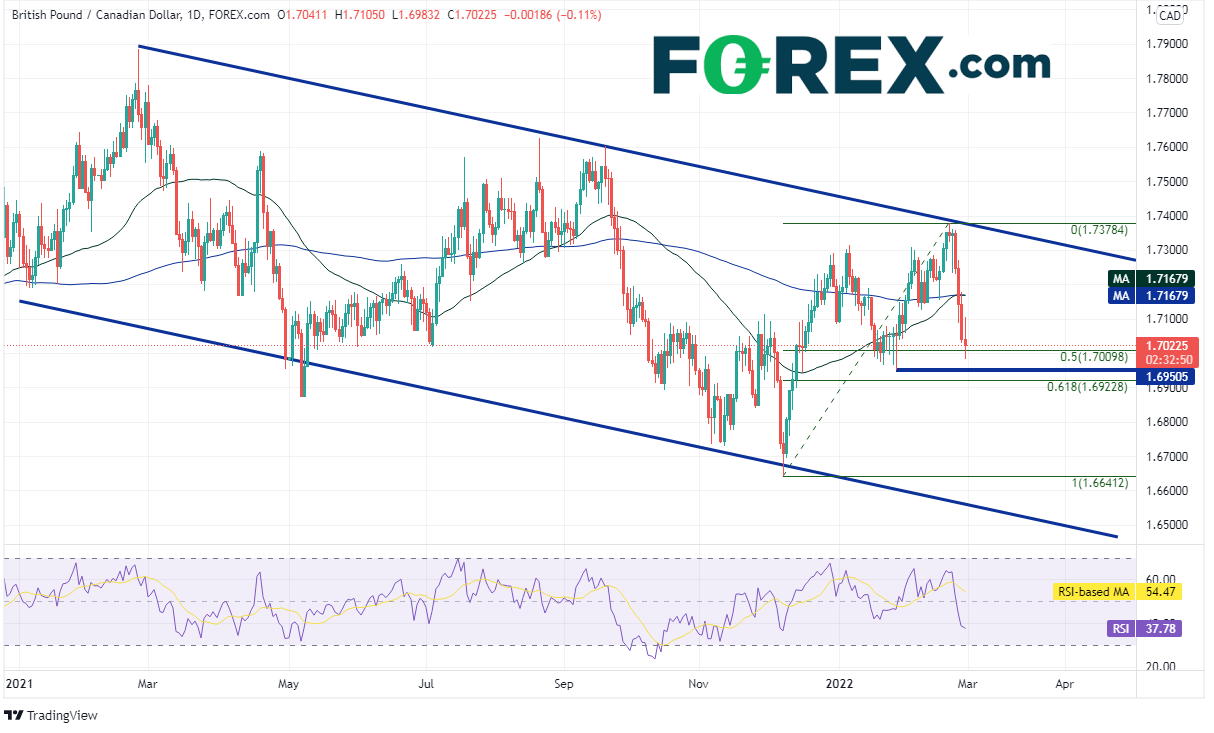 2021年2月底以来英镑/加元一直交投于下降通道内,后来在距今较近的12月8日击穿1.6641附近的通道下轨趋势线,形成锤子形态后于今年2月21日回升至通道顶部1.7378。该货币对此后回吐前述区间的一半涨幅并在周一考验1.7000的心理整数支撑位。