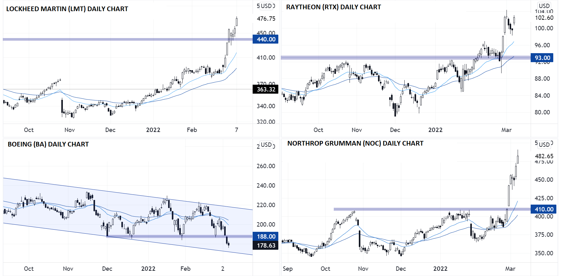 国防公司的业绩高度依赖经济体量也高度取决于其与决策层的关系的好坏,所以从逻辑上预期,国防支出情境下受益最多的将是那些规模最大的公司。正如我的同事Becca Cattlin在 “地缘政治紧张时需要关注的国防股”一文中所说,按营收计,该领域最大的参与者是Lockheed Martin (LMT)、Raytheon Technologies (RTX)、波音 (BA) 和 Northrop Grumman (NOC)。