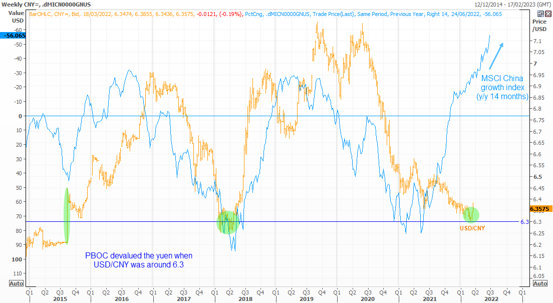 接下来是第二点。MSCI中国成长指数与美元/离岸人民币之间存在着饶有趣味的(倒置)相关性。据MSCI描述,前述指数“捕捉在中国股市上展现整体成长风格特征的大盘股和中盘股”。