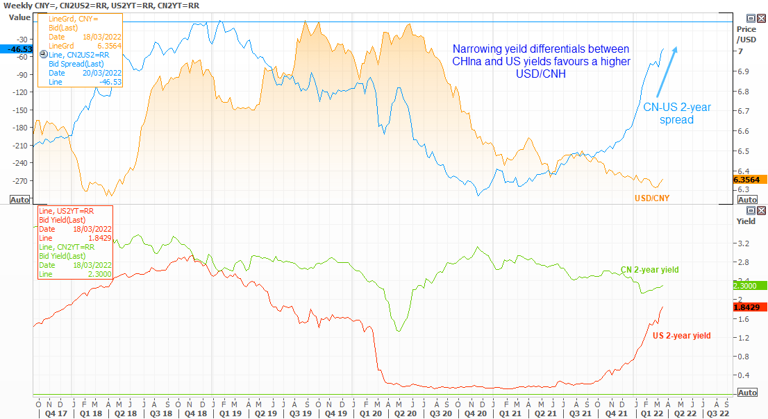 上图蓝色线条表示MSCI中国成长指数的年率百分比变化,并前移3个月,应可作为美元/离岸人民币的领先指标。该指数在2021年上半年筑底,此后领先于美元/离岸人民币加速上扬。鉴于美联储现进入积极加息周期,中美2年期债券收益率已收缩至2021年2月以来最低点。所以我们有理由认为,美元/离岸人民币后市上涨可期。