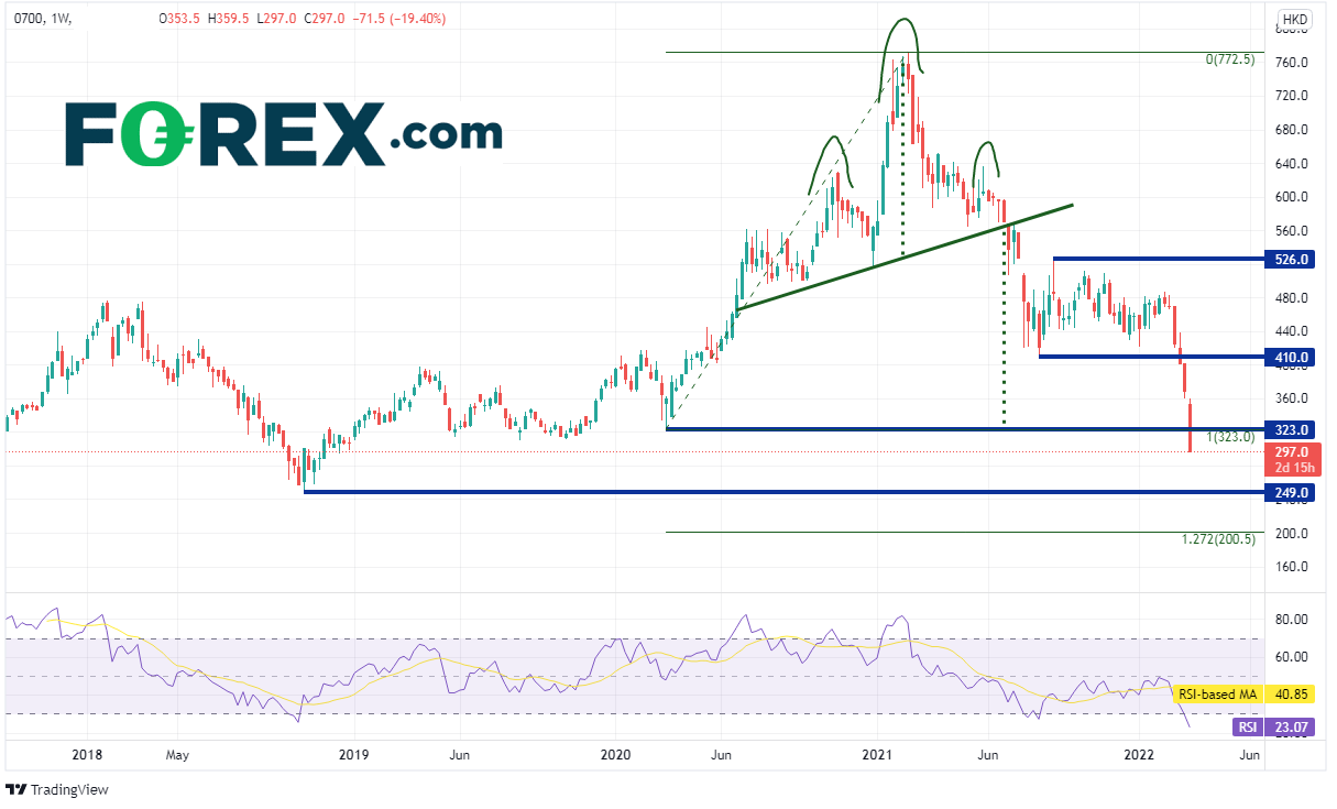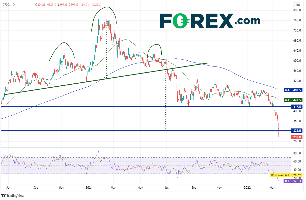 腾讯控股有限公司(简称腾讯)可能面临数亿元的创记录罚款,过去两天股价下跌近20%。有媒体报道,该公司旗下的微信支付移动网络违反了中国人民银行《充分了解你的客户》与《充分了解你的企业》的规定,以及未能监管非法资金转移与洗钱,比如与赌博有关的交易等,可能遭到数亿元的罚款。该大型科技公司到目前为止避过了中国当局对科技公司的重拳治理。另外值得注意的是,腾讯股价的下跌是为恒指过去11个交易日下跌20%的整体颓势所累。