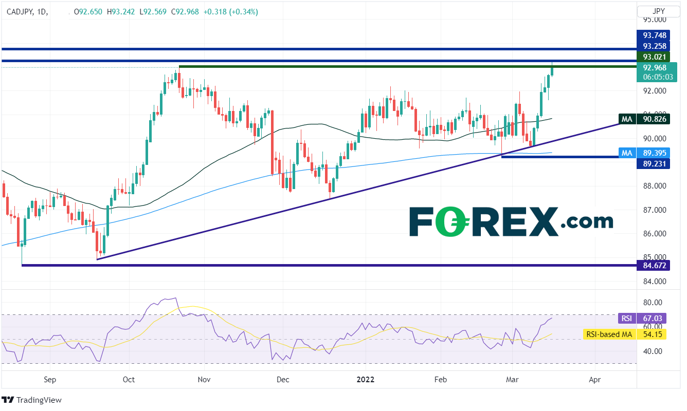 加元/日元于2021年8月20日在84.67附近构筑锤子低点,之后大举上攻,于当年10月21日摸至93.02。该货币对自此交投于上升三角形形态内,与此同时未能摆脱50天和200天均线的束缚。过去一周里,加元/日元和大部分日元货币对一样跟随上涨的利率走高。叠加强于预期的通胀与强劲的就业数据,加元/日元今天继续上行,攻克10月21日前高点93.02后创下2015年11月以来最高点。今天高点93.25也是2015年11月以来高点,构成阻力位。