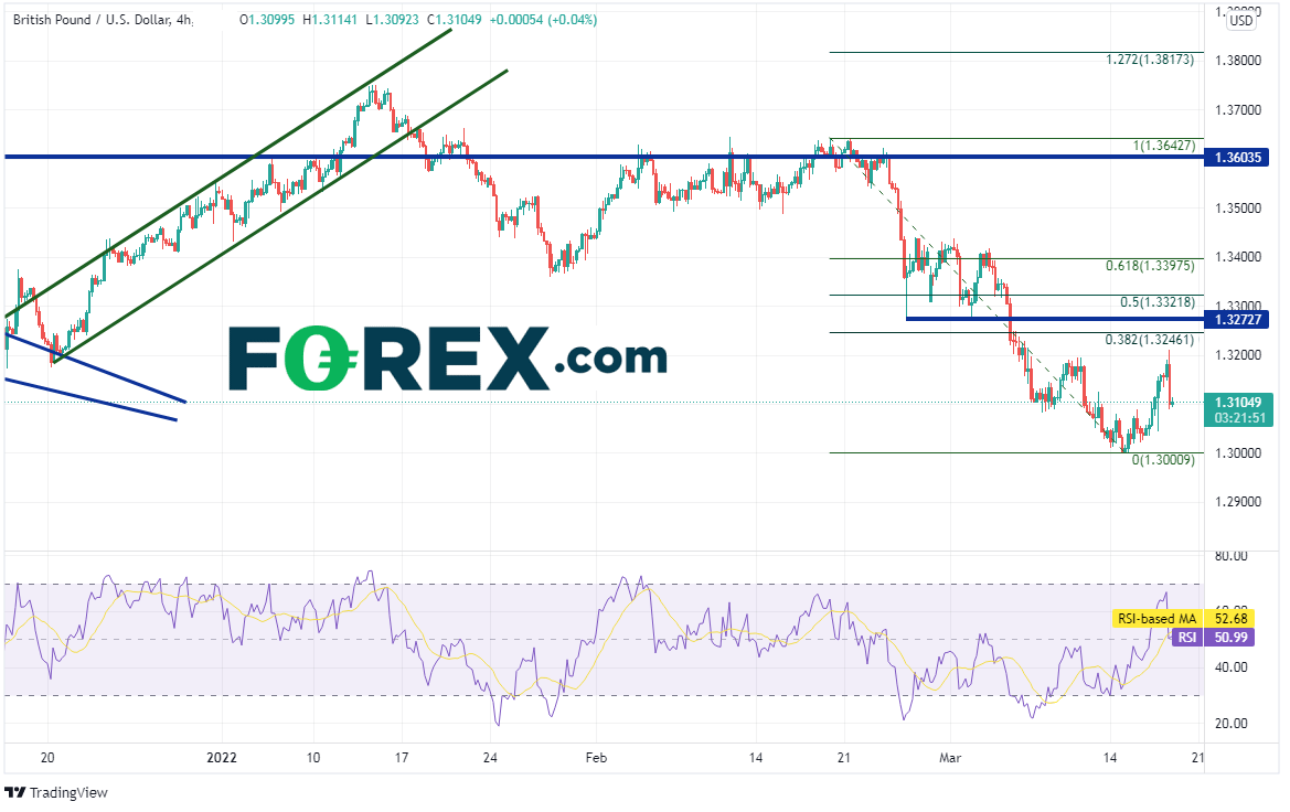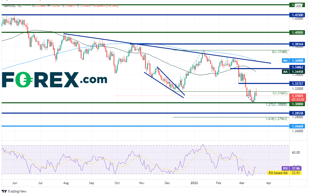 英镑/美元在2020年6月1日最高摸至1.4250,此后高点和低点不断下降。该货币对1月中旬在1.3160附近摆脱下降楔形,之后回到下降趋势线1.3749附近。英镑/美元随后再度回撤并于3月15日创下新低1.3000,那也2021年12月9日低点到1月13日高点行情的127.2%扩展位兼心理整数关口。