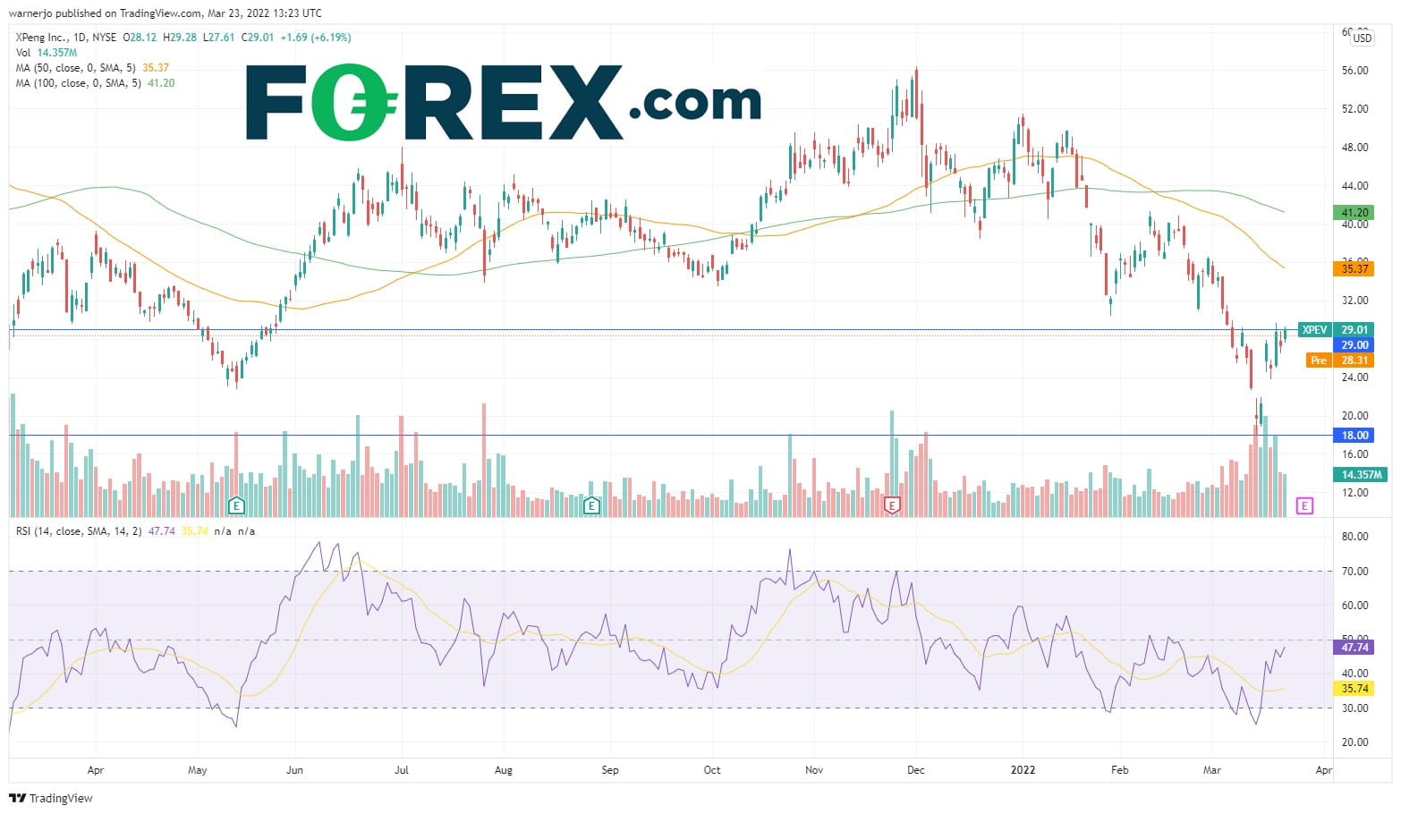 当前上涨趋势得到一个事实的支持,即同期5天平均成交量是100天平均成交量的近两倍。但股价过去三个时段多次突破29都没能取得太大的成功,表明上涨动能业已耗尽。保持当前上涨趋势不变并先后上攻50天简单移动均线所在的35和100天均线兼2月高点所在的40,前提是突破并持续走高。考虑到小鹏汽车股价承受的下行压力大部分来自中国政府誓言解决的问题,后市有可能迅速反弹。目前有20家经纪商给出小鹏汽车未来一年股价近乎翻倍,至55上方的评估。