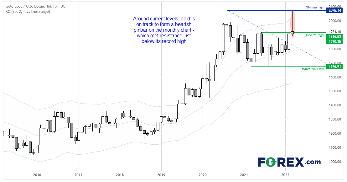 技术面看,黄金月图有望走出一根大型pinbarK线,其高点距离历史高点仅有5美元,现在还不能断定是否进入修正阶段。但对一般交易者来说,一个月太长,周图日图等时间周期较短的图表上有不少的交易机会。但简略看下月图有助于我们了解大局,目前直观来看未来几周可能迎来惊涛骇浪。