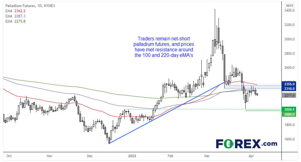 本周上涨的美元携手疲弱的中国PMI数据进一步打压钯金价格,并且期货市场的持仓仍为净空头。事实上,交易者过去三周增持空头头寸并减持多头持仓。