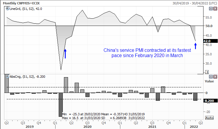 最近新冠病例数增加以及为了遏制疫情而随之展开的限制措施,拖累中国服务业活动。中国服务业PMI自50.2下跌至42,是2020年一季度疫情最严重时期以来最高收缩速度,8.2点的跌幅也是2021年8月以来最大月度跌幅。