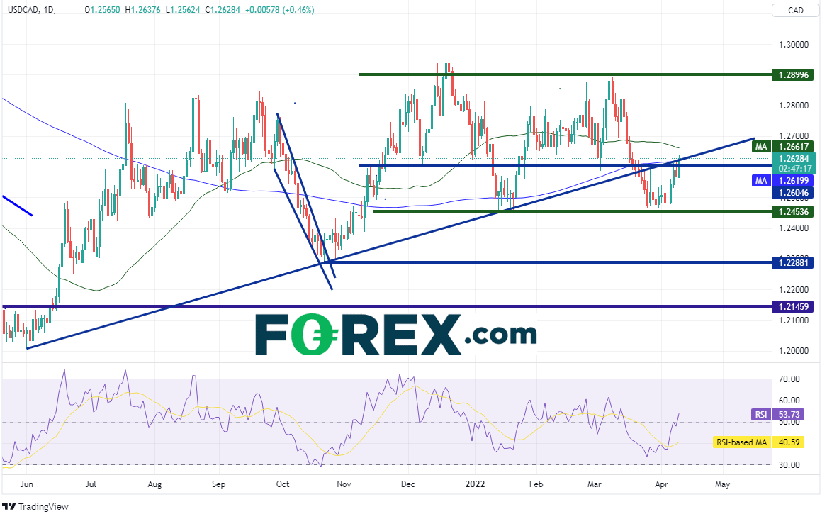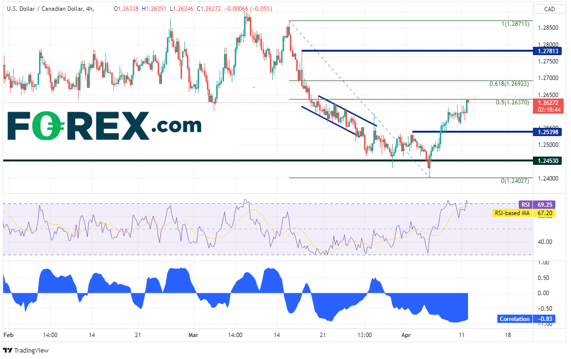 美元/加元4小时图回到了3月15日高点到4月5日低点行情的50%回档位,上方阻力位先后落在50天均线1.2660(请看日图)、前述行情的61.8%回档位1.2692附近以及水平阻力位1.2781。但请注意,RSI已进入超买区域,暗示价格或蓄势回调。下档支撑位先后落在200天均线、水平支撑位1.2540、4月5日低点1.2402附近。