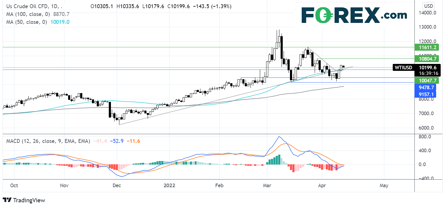 油价自4月11日低点92.00反弹,收复了50期均线、上升趋势线,加上MACD下跌趋势减弱,表明后市可能扩大上行。