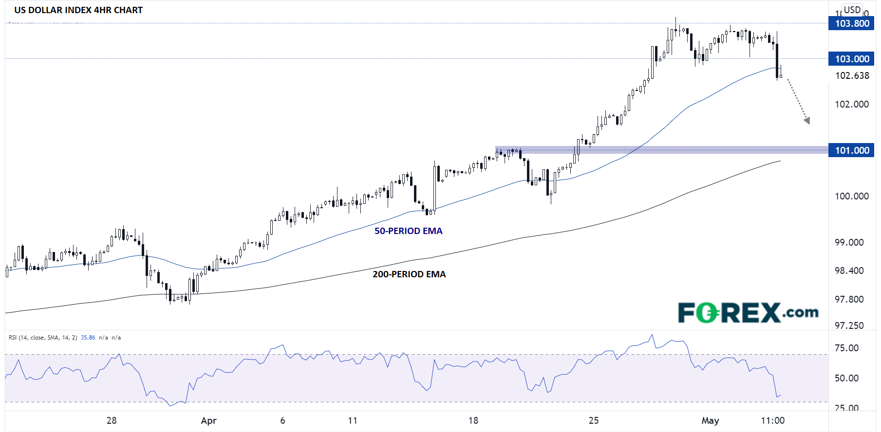 展望后市,如果经济数据(特别是通胀方面)没有大的意外,交易者或以今天的新闻发布会为“强硬基调最高潮”的标志,认为美联储至少短期内可能不会再加码。所以,美元或至少回吐今年前四个月涨幅的一部分。美元指数方面,只要受制于103.00-103.80,后市可能下看100.00-101.00区间: