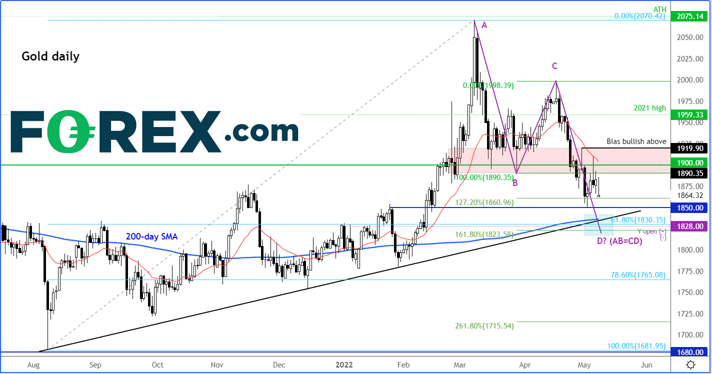 金价最近下破1900支撑位,打开跌至1830附近重要技术区域的大门,那是200天均线和上涨趋势线、AB=CD形态的D点、8月以来反弹行情的61.8%回档位相汇处。所以,有机会在该处展开某种反弹。但只有看到上抬的高点(按目前情况看,最新高点就在1920下方不远处),我们才可能转为看涨黄金。