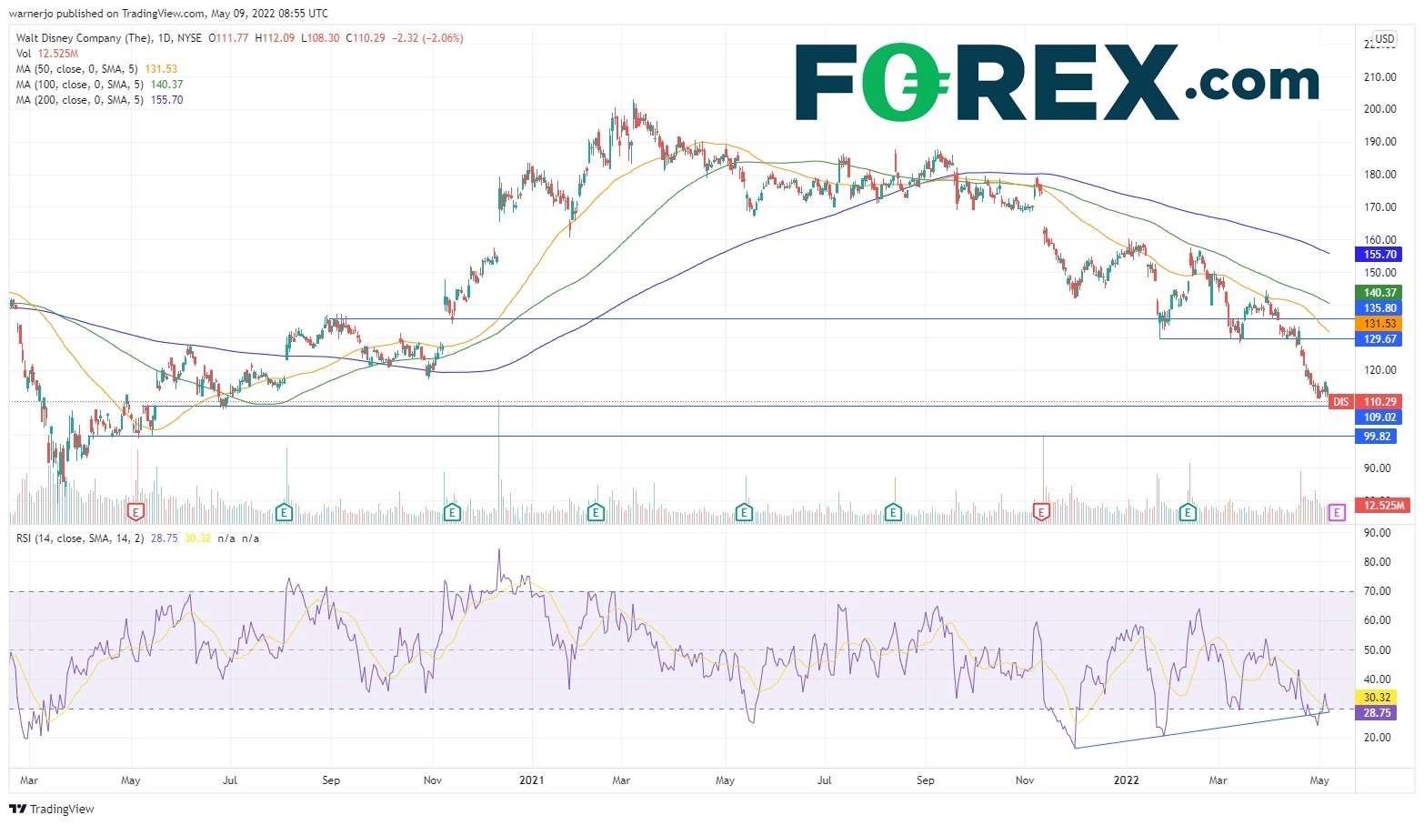 如果可以扭转颓势,股价可望快速反击130,然后尝试收复50天均线,再上看2020年9月以来阻力135。如果攻克,重点在100天简单移动均线140和200天简单移动均线所在的155。34家经纪商对未来一年的看法更是乐观,认为迪士尼平均目标股价在183。