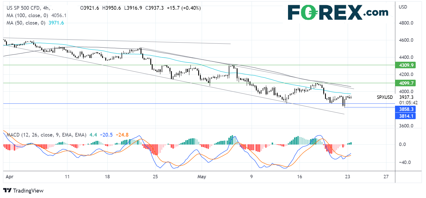 标普500指数自4月21日以来一直处于下跌通道内,构筑一系列低点降低和高点降低。上周五,该股指探入23个月低点3810,目前正试图反弹。MACD指标看涨交叉支持进一步上行。但买盘需要带动股指突破4小时图50均线3975和4056的100均线后才能向5月中旬高点4100阻力位发起攻击,构筑高点抬高。若未能收复50均线,价格或回探5月19日低点3865,然后是2022年低点3910。