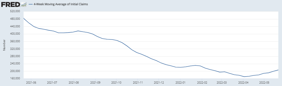 接下来我们观察一些较传统的经济数据,比如四周均请人数。4月初,四周均请人数为17万左右,创下历史低点。随后这个数字不断增大,持续时间为疫情爆发以来最长,此文发稿时增至20万左右: