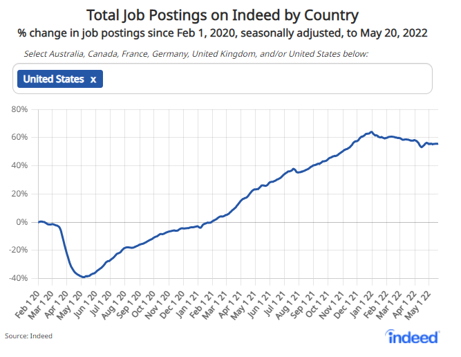 值得注意的是,高频数据呈现一些就业增长可能放慢的早期信号。比如,Indeed.com上发布的总职位数年初以来走平,而同期前后美国职位发布的同比增长率达到顶峰,只是相对疫情前的水平还是激增55%: